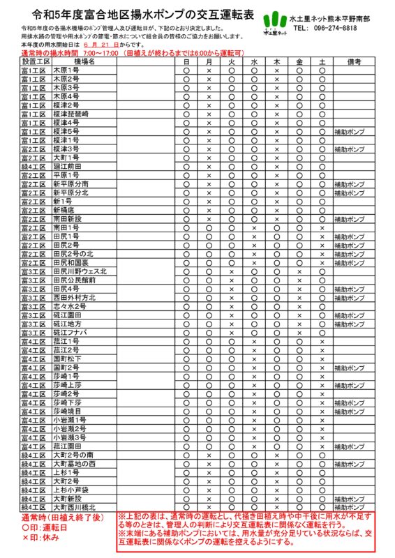 令和5年 富合地区揚水ポンプの交互運転表